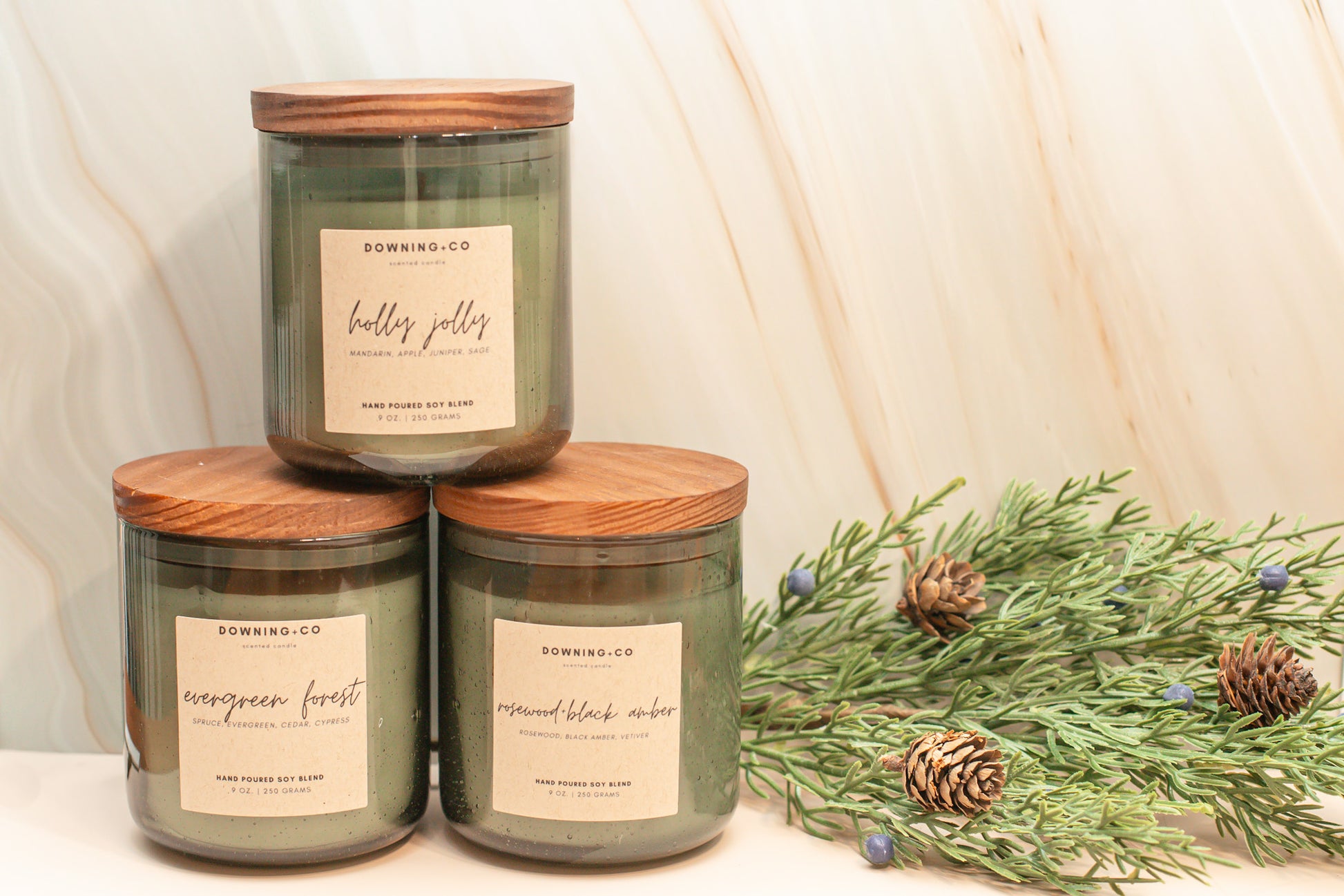 Proprietary soy blend featuring braided cotton wicks and clean fragrances.